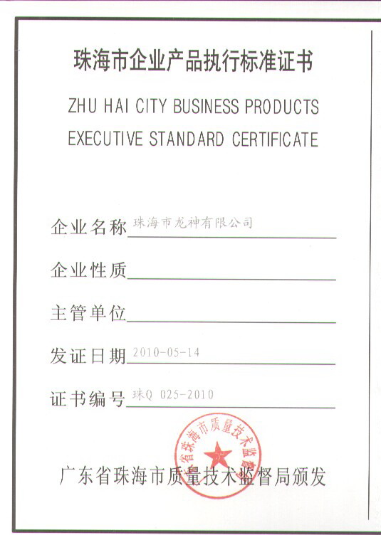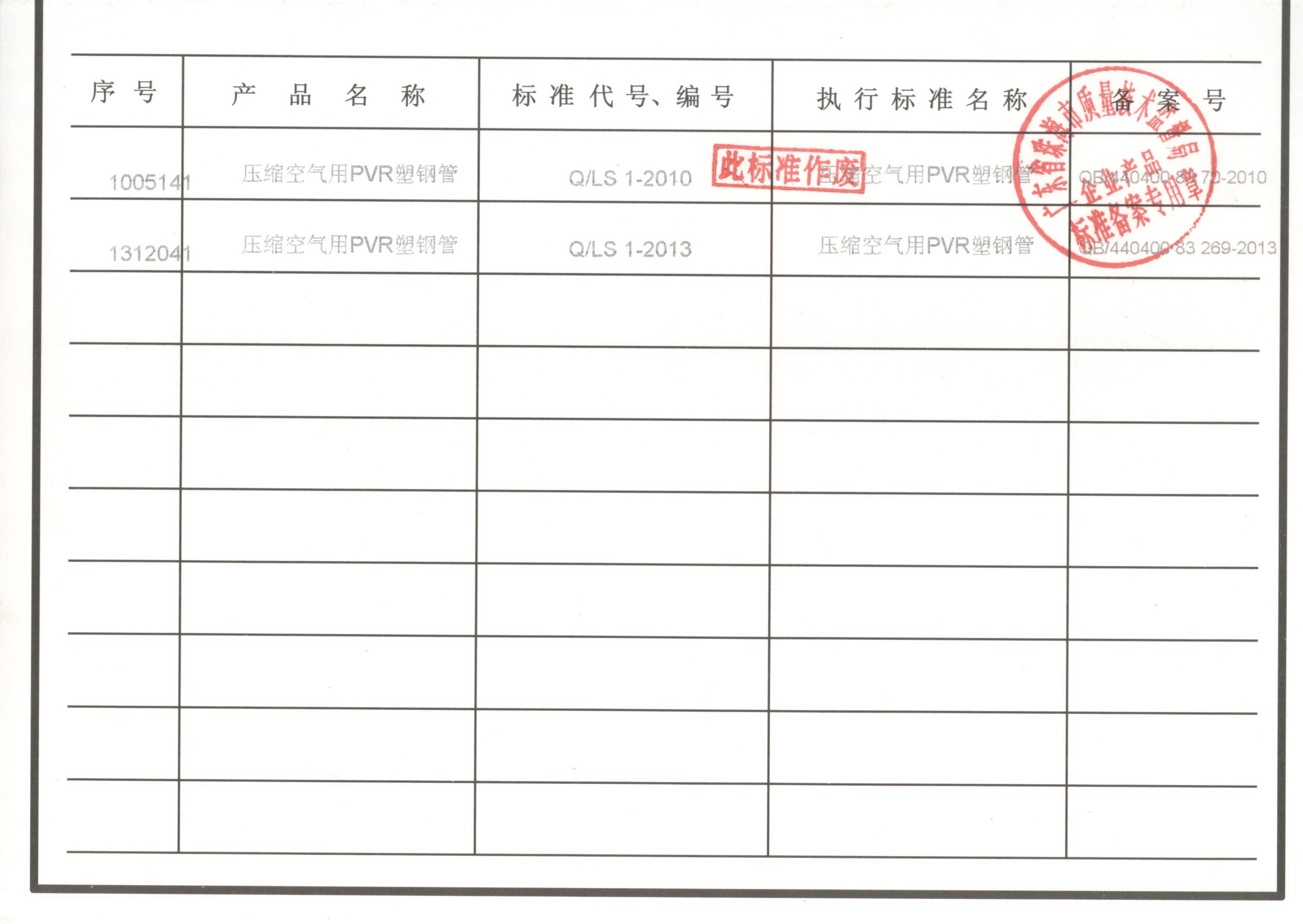 企業(yè)執(zhí)行標(biāo)準(zhǔn) 珠海市企業(yè)產(chǎn)品執(zhí)行標(biāo)準(zhǔn)證書 珠海市龍神有限公司企業(yè)執(zhí)行標(biāo)準(zhǔn) 壓縮空氣用PVR塑鋼管 2012-11-27 34790