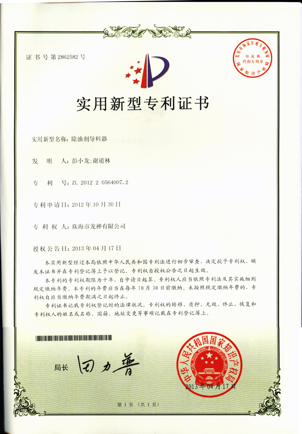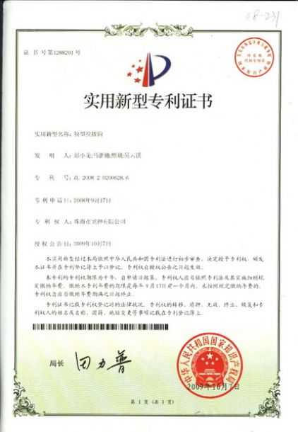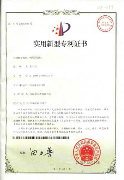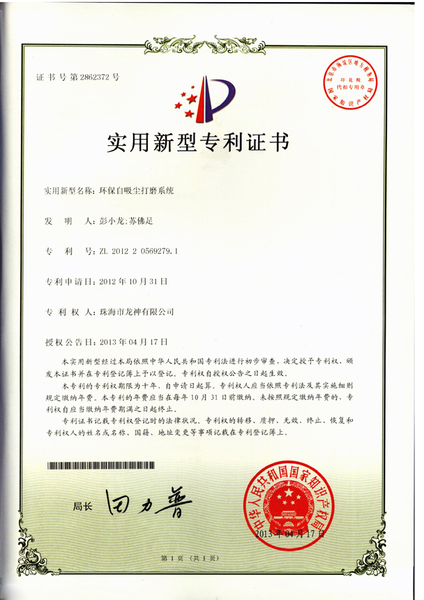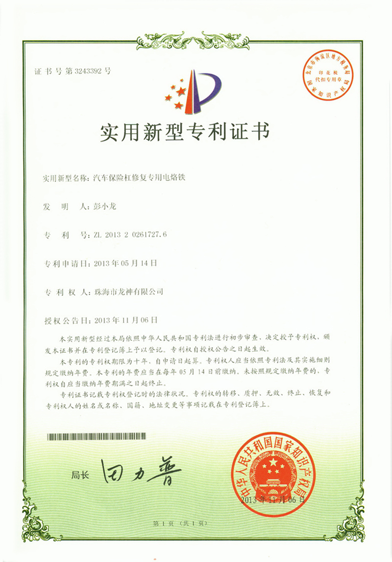 企業(yè)榮譽(yù) 調(diào)漆裝置專(zhuān)利證書(shū) 噴漆柜專(zhuān)利證書(shū)遮蔽紙切紙架專(zhuān)利證書(shū) 塊型拉拔鉤專(zhuān)利證書(shū) 噴槍清洗機(jī)專(zhuān)利證書(shū)無(wú)靜電干燥加熱器專(zhuān)利證書(shū) 壓縮空氣空壓機(jī)房供應(yīng)系統(tǒng)專(zhuān)利證書(shū)除油劑導(dǎo)料器專(zhuān)利證書(shū)多功能?chē)姌屒逑礄C(jī) 環(huán)保自吸塵打磨系統(tǒng) 切膜裝置汽車(chē)保險(xiǎn)杠修復(fù)專(zhuān)用電烙鐵 精確可調(diào)整形架專(zhuān)利證書(shū) 移動(dòng)式無(wú)塵干磨專(zhuān)利證書(shū) 管道快速連接件專(zhuān)利證書(shū) 彭小龍總經(jīng)理證書(shū) 2012-11-27 30755