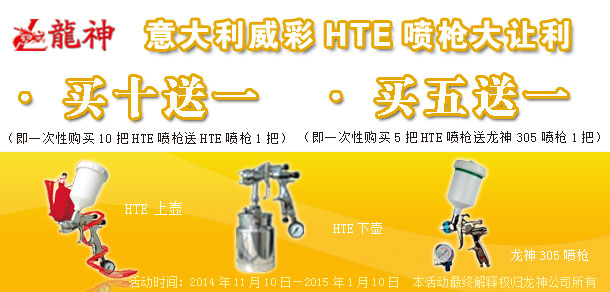 2014年11月吉尼斯HTE噴槍"初冬.讓利"大促銷 2014-11-11 16576 活動(dòng)內(nèi)容: 1、買(mǎi)十送一(即一次購(gòu)買(mǎi)十把HTE噴槍送一把HTE噴槍) 2、買(mǎi)五送一(即一次購(gòu)買(mǎi)五把HTE噴槍送一把龍神305噴槍) 活動(dòng)期間HTE上下壺噴槍的贈(zèng)送方式為:以多贈(zèng)送原則(如:買(mǎi)6把上壺+4把下壺,贈(zèng)送上壺。反之亦然,以此類推。)
