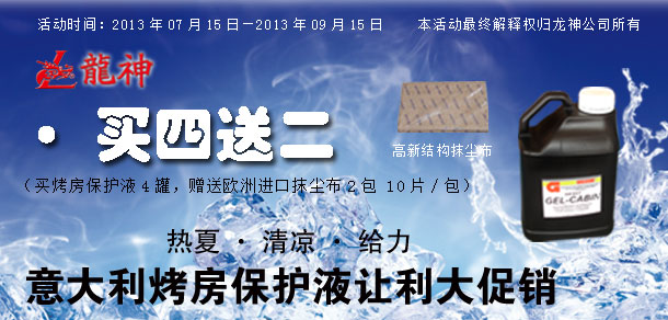 "熱夏 清涼 給力" 意大利烤房保護(hù)液讓利大促銷! 2013-07-16 25233 "熱夏 清涼 給力" 意大利烤房保護(hù)液讓利大促銷!活動(dòng)時(shí)間:2013年07月15日至2013年09月15日。 時(shí)長(zhǎng):共計(jì)2個(gè)月