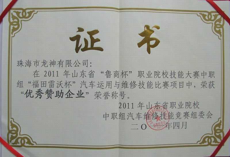4月7日,在「2011年山東省“魯商杯”職業(yè)院校技能大賽」中職組“福田雷沃杯”汽車運(yùn)用與維修技能大賽項(xiàng)目中,我司榮獲“優(yōu)秀贊助企業(yè)”榮譽(yù)稱號(hào)。
