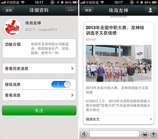 珠海龍神官方微信敬請(qǐng)關(guān)注! 珠海市龍神有限公司公共微信號(hào)已申請(qǐng)成功,請(qǐng)大家多多關(guān)注! 掃描二維碼,也可直接搜索公眾微信號(hào)“珠海龍神” 我們將不定期發(fā)布公司最新資訊。 您也可以發(fā)消息和我們進(jìn)行互動(dòng)。 查看歷史消息收看您錯(cuò)過的動(dòng)態(tài)新聞,讓您第一手掌握最新動(dòng)態(tài)。 2013-09-18 16498